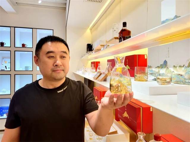 故宮是文創(chuàng)界的頂流IP,近期在故宮博物院文創(chuàng)旗艦店新上線了兩款精美杯子——“千里江山”炫彩玻璃杯和酒具套裝。杯底的金色山峰層巒疊嶂,意境悠遠。這款杯子是由王曉波帶領(lǐng)團隊設(shè)計制作的。