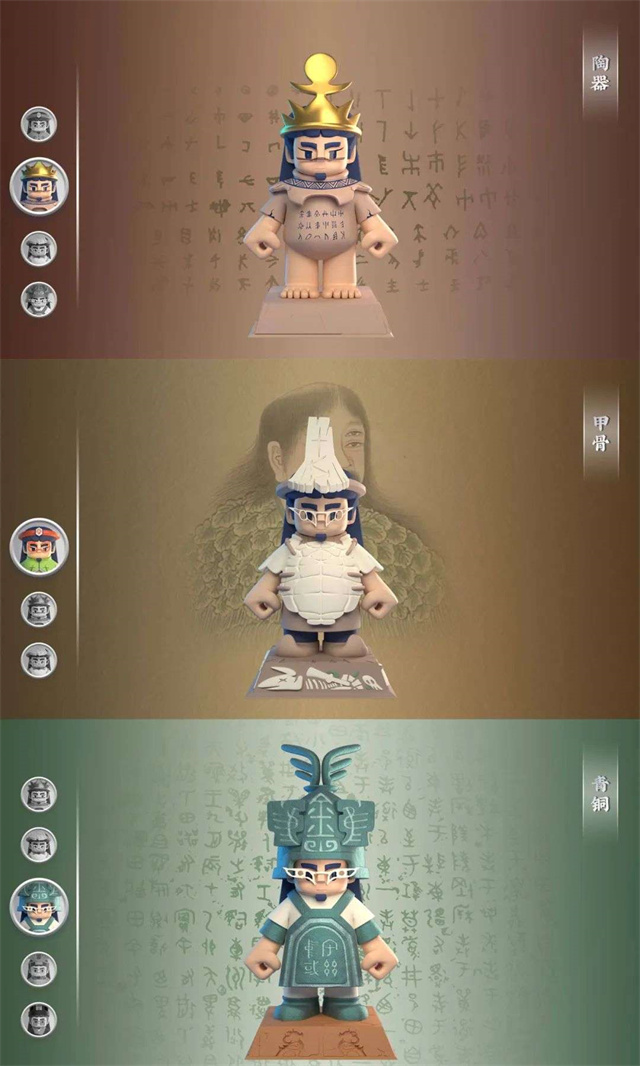 IP形象是以傳說中創(chuàng)造漢字的倉頡為創(chuàng)意原型,通過對其造型的系列化結(jié)構(gòu)設(shè)計與涂裝,體現(xiàn)漢字書體與對應(yīng)工具材料呈現(xiàn)載體的發(fā)展變化歷程,以及與之同時期的服飾與裝飾藝術(shù)特征。包括小倉頡主形象和穿越于不同漢字發(fā)展時代九個不同的形象設(shè)計,表現(xiàn)十種代表性書體與其相應(yīng)的工具材料載體,體現(xiàn)了漢字發(fā)展與科技進步的緊密關(guān)系。