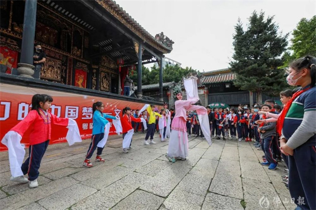 佛山市第一小學(xué)學(xué)生在萬福臺(tái)與粵劇演員互動(dòng)學(xué)習(xí)。