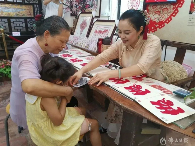 南風(fēng)古灶旅游區(qū)進(jìn)駐了饒寶蓮等一批非遺傳承人工作室。圖為佛山剪紙非遺傳承人饒寶蓮正在教小朋友做剪紙。