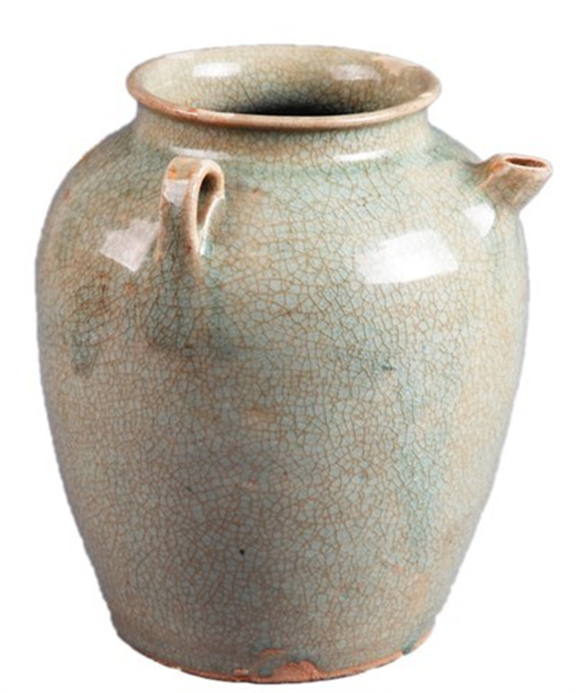 梅縣水車窯是粵東地區(qū)著名的青瓷窯,創(chuàng)于初唐,盛于中晚唐,其產(chǎn)品曾沿著海上絲綢之路遠(yuǎn)銷東南亞和西非地區(qū)。水車窯青瓷是客家先民的日常生活器物,器型豐富,質(zhì)量精良。唐代青釉雙系壺是館藏水車窯瓷器中的代表作品。此壺胎色呈灰青色,胎質(zhì)堅(jiān)硬、厚實(shí)。微侈口,短頸,雙豎耳,肩部飾雙系及一短嘴流,平底。外形穩(wěn)重壯實(shí),是水車窯最具山地特色的造型品種之一。除足底外通身施釉,青釉純正,釉質(zhì)類冰似玉。