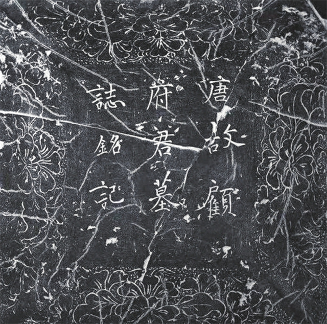 墓志的志蓋上刻有“唐故顧府君墓志銘記”九個(gè)字,為唐楷,稍帶魏碑風(fēng)格。有別于一般墓志銘蓋上的八字,多一“記”字,這是很罕見(jiàn)的現(xiàn)象。另外“記”字書寫方法也比較特別,在唐代非常少見(jiàn)。墓志銘書法精美,均為小楷,帶有魏碑遺韻,勁挺含蓄。