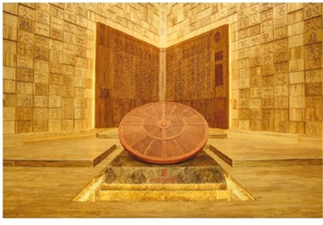 中國印刷博物館序廳:前為轉(zhuǎn)輪排字盤,后為《夢溪筆談》。