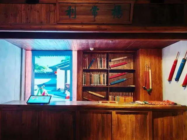 來到雨巷場景,便可看到別具江南特色的場景設計,伴有多媒體動態(tài)的江南雨景,仿佛置身于戴望舒的詩歌《雨巷》,情景相融,動靜結合。場景內還提供了油紙傘道具,大家可以撐起油紙傘,扮演詩歌中的“丁香姑娘”。