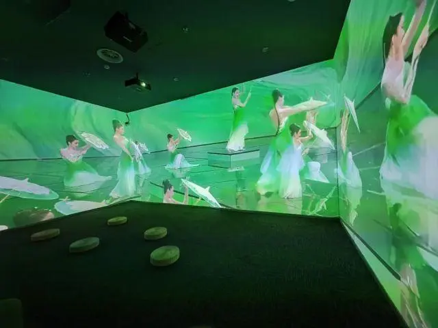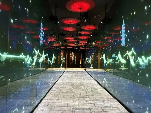 序廳長廊序廳長廊的頂部保留原先紅傘造型,過道空間的兩邊利用多媒體技術在墻面投影四季變化的江南煙雨景色,地面投影春雨、夏雨、秋葉、冬雪的自然意象視頻畫面,沉浸式體驗感一秒拉滿。