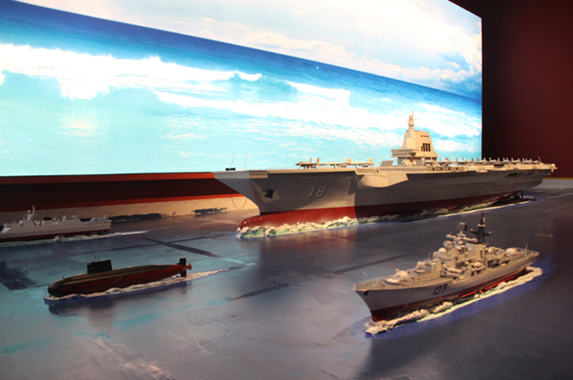 在二層的“自強之道——船政歷史文化陳列”中,大量運用了場景還原的方法,生動講述船政歷史。大型沙盤再現(xiàn)了船政十三廠熱火朝天的生產(chǎn)場景;微縮模型生動呈現(xiàn)了艦船制造的全過程;大型雕塑、模型還原了“左宗棠三顧宮巷”的場景、船政學堂教學場景、馬江海戰(zhàn)將士“艦雖亡,旗還在”的英勇精神等。記者看到,“福建艦”1∶100比例的模型攜帶著寧德艦等以福建城市命名的軍艦,一同亮相博物館。