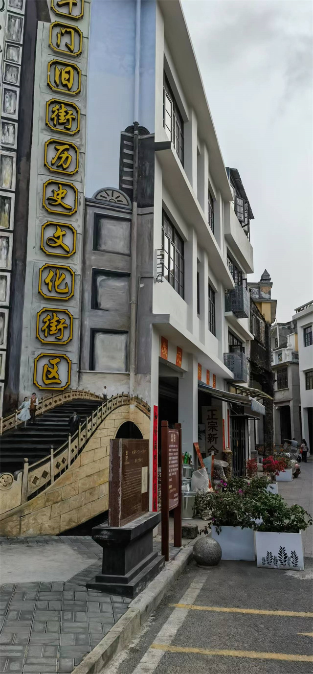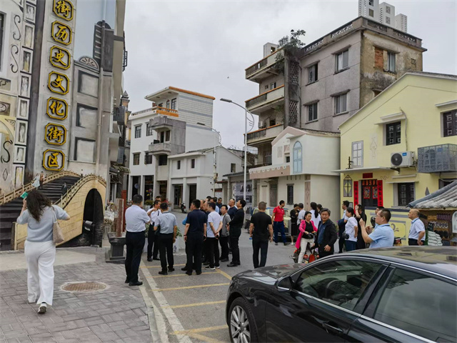 周勇會長一行首先來到了斗門歷史文化街區(qū)。斗門舊街位于斗門鎮(zhèn)核心區(qū)域,十九世紀(jì)末到二十世紀(jì)初由加拿大牧師、建筑工程師嘉理慰等人規(guī)劃設(shè)計(jì),是一條具集市貿(mào)易功能的商業(yè)街。全街呈“丁”字形,全長500多米,街道兩旁是緊密排列的騎樓商鋪,建筑風(fēng)格獨(dú)特,博采歐美各國古典建筑之精華、吸取南洋島國之建筑理念、秉承中國嶺南建筑之風(fēng)騷。斗門舊街在明嘉靖年間就形成了墟市,發(fā)展于清雍正十一年,2022年2月,珠海市為了更好的保護(hù)舊街古跡、再現(xiàn)地方特色和文化價值,對其啟動了修繕工程,先后修繕了包括20棟歷史建筑、30棟風(fēng)貌建筑、24棟一般建筑在內(nèi)的74棟建筑,修繕內(nèi)容包括對外墻面翻新、灰塑壁畫修復(fù)、門窗保養(yǎng)及部分環(huán)境風(fēng)貌整治等。